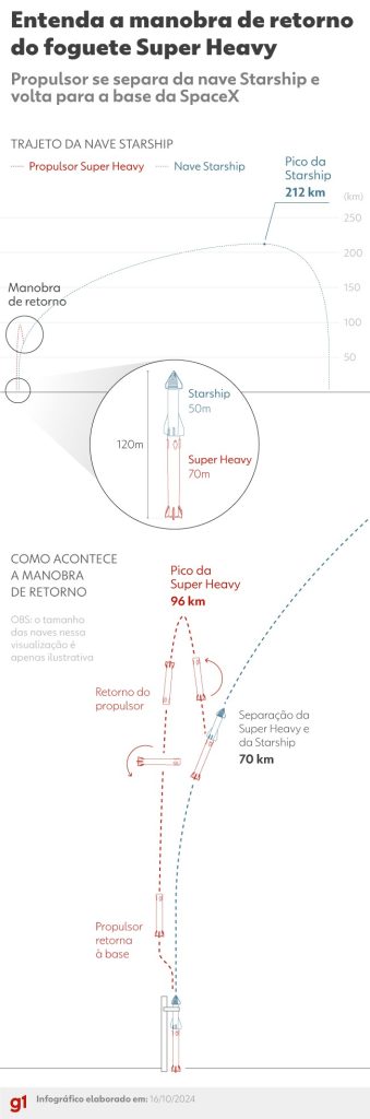 Após se separar da nave, o foguete começou o movimento que o levaria de volta para o solo. Como o lançamento tem a forma de um arco, o Super Heavy subiu mais 26 km, praticamente na horizontal, até começar sua descida, onde atingiu quase 4.400 km/h.